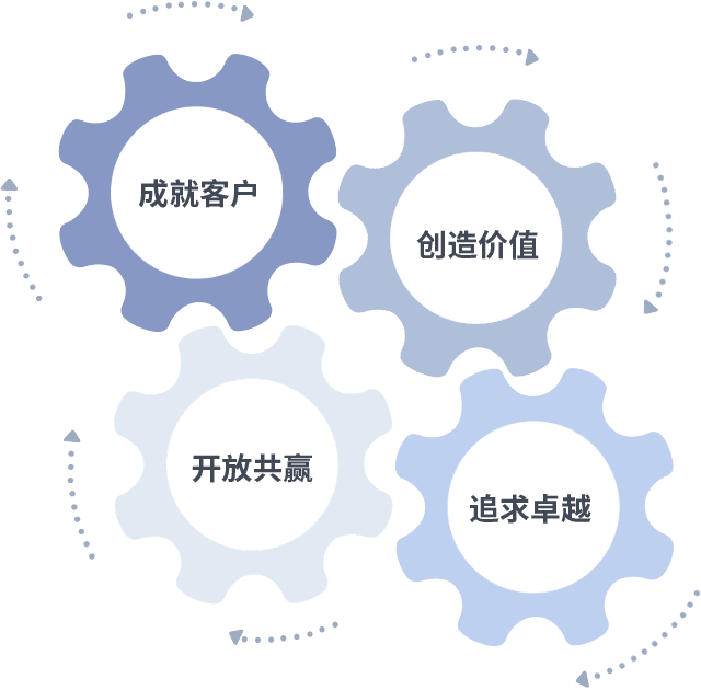 成就客户是一切决策的出发点,,创造价值是衡量所有工作的标准,,追求卓越是我们做事做人的态度,,开放共赢是我们的格局也是最终的结果。。。价值观的齿轮环环相扣,,推动着组织里的每个人不断向前。。